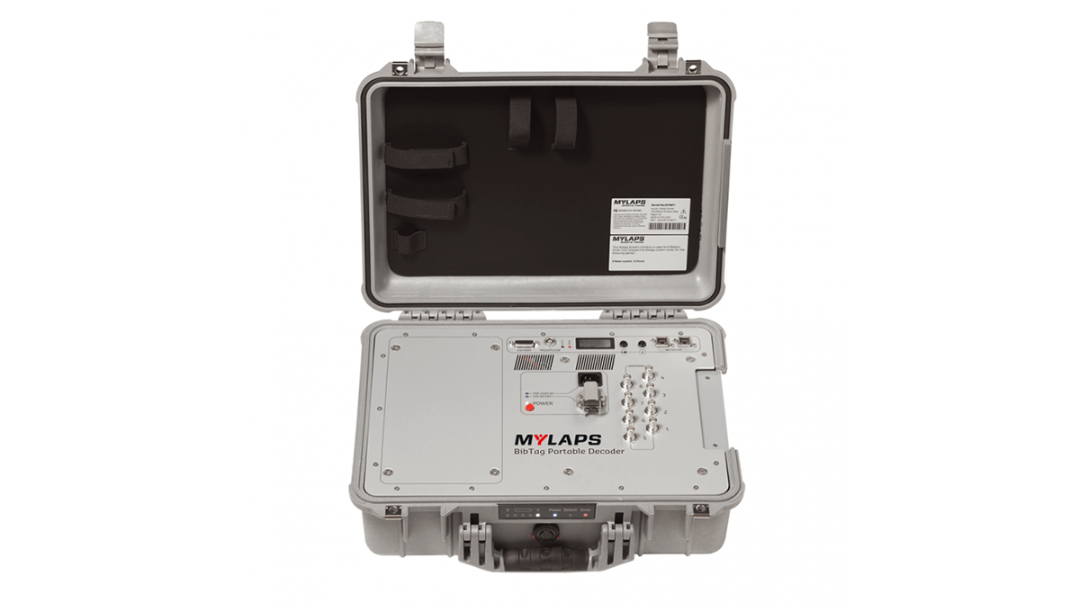 The decoder is attached to the mats and decodes the BibTag signals into the athletes IDs and their measured times. Portable decoders have an integrated battery and can measure up to 50 BibTag passing per second.